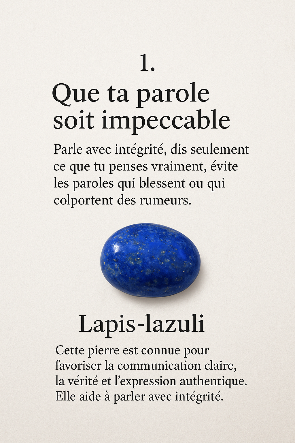 Parle avec intégrité, dis seulement ce que tu penses vraiment, évite les paroles qui blessent ou qui colportent des rumeurs.