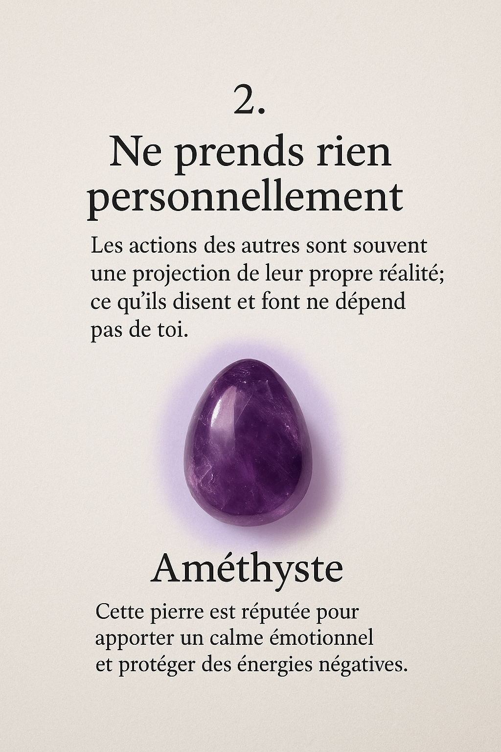 Ce que les autres font ou disent est le reflet de leur propre réalité, pas de la tienne. Ne te sens pas offensé ou blessé par leurs paroles ou actions.
